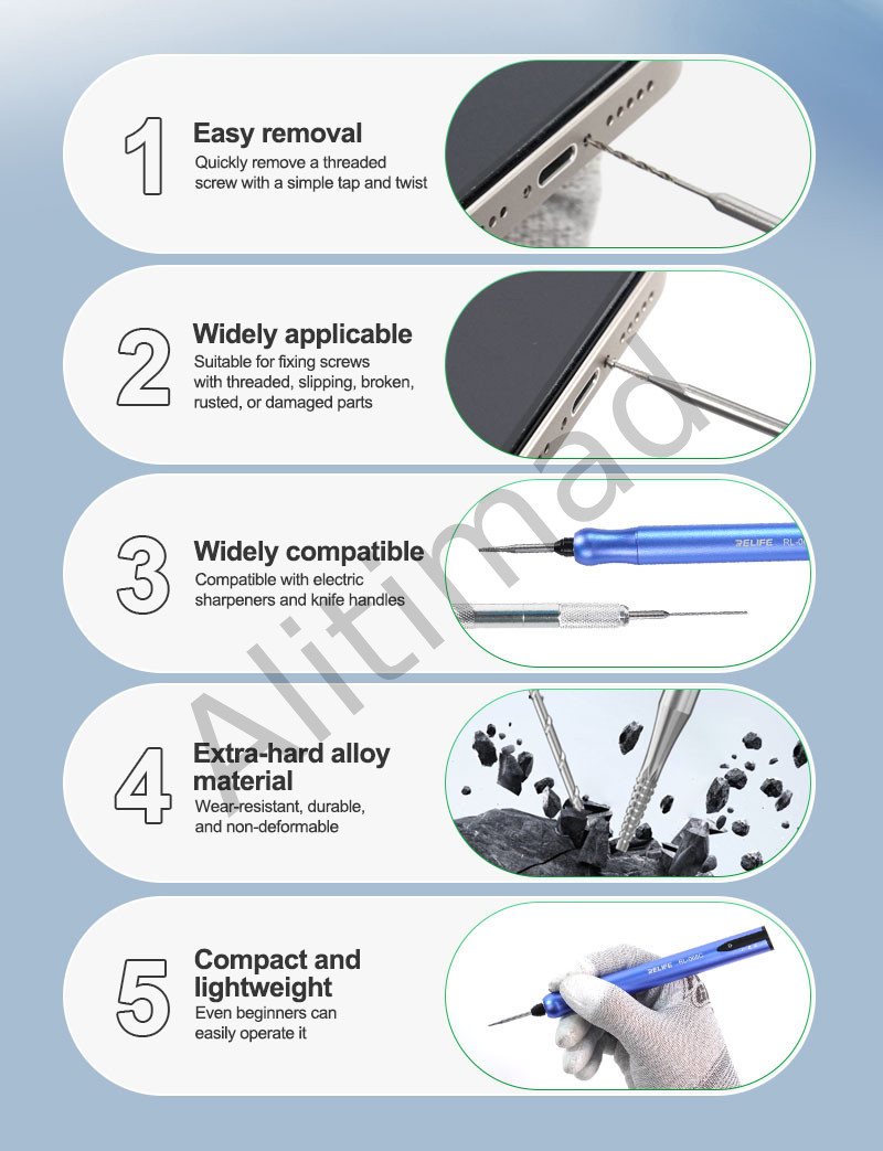 1. مجموعة رؤوس مثقاب لولبية منزلقة من نوع RELIFE TX1. 2. قطر المقبض Φ2.35 مم، متوافق مع معظم أدوات الشحذ الكهربائية ومقابض السكاكين الموجودة في السوق. 3. مادة سبيكة شديدة الصلابة. فولاذ فائق السرعة + فولاذ التنجستن لمقاومة التآكل والمتانة ومقاومة التشوه الممتازة