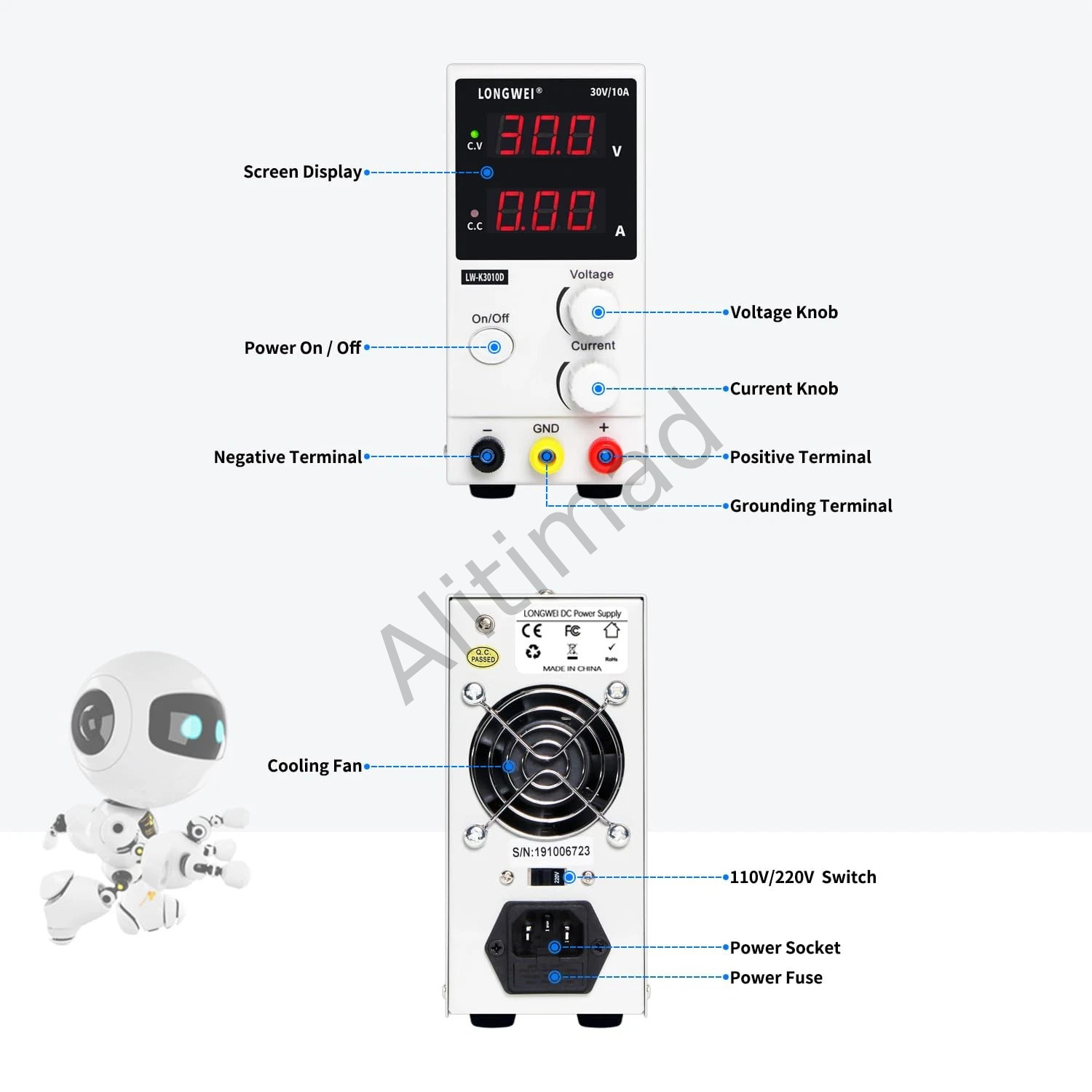 2. مزود طاقة تبديلي، وهو مزود طاقة تيار مستمر منظم عالي الكفاءة ومستقر. 3. يمكن استخدامه كمصدر طاقة بجهد ثابت أو كمصدر طاقة تيار مستمر بتيار ثابت. 4. مزود بدائرة حماية مثالية، مما يجعله مناسبًا للعديد من التطبيقات. 5. مناسب للبطاريات القابلة لإعادة الشحن، وتصنيع لوحات الدوائر المطبوعة/المحركات، ومنتجات LED، واختبار مراوح التيار المستمر/الطلاء الكهربائي، والتحليل الكهربائي، واختبار تقادم المكونات الإلكترونية/المختبرات، والمعدات الإلكترونية، ومعدات الاختبار الآلية/وجميع التطبيقات الأخرى التي تتطلب استخدام التيار المستمر. المواصفات: الحالة: جديد تمامًا بنسبة 100%، رقم الموديل: LW-K3010D، الجهد: 100-240 فولت، 50-60 هرتز، جهد الخرج: 0-30 فولت، تيار الخرج: 0-10 أمبير، الدقة: 0.01 فولت، 0.01 أمبير. شاشة عرض عالية الدقة بأربعة أرقام. الكفاءة: >85%. بيئة التشغيل: -10 إلى +60 درجة مئوية / رطوبة نسبية 30% / رطوبة نسبية 90%. ضبط الجهد: معدل تنظيم الحمل (10 - 100%): 50 مللي فولت. تنظيم الخط: (200 - 240 فولت تيار متردد) 20 مللي فولت. التموج والضوضاء: (ذروة إلى ذروة) 50 مللي فولت . الوزن: حوالي 1730 غرام / 61.0 أونصة.